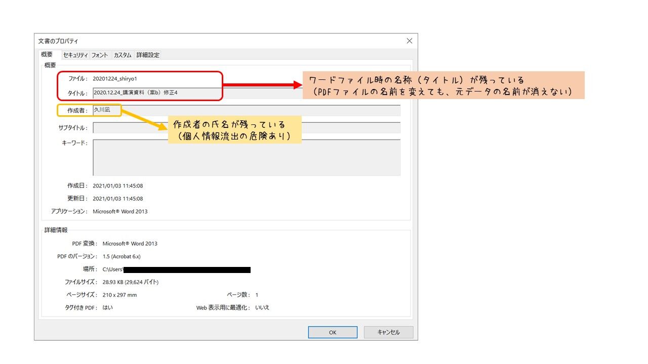 この「PDFファイルのメタデータ」が意外と厄介で、下手をすると炎上案件を引き起こしかねません。