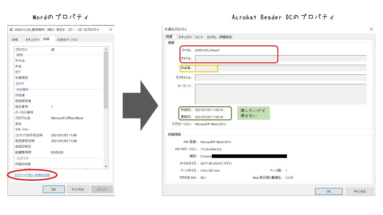 ファイルの中身(本文)だけではなく、プロパティ内にも情報(メタデータ)が潜んでいるからです。