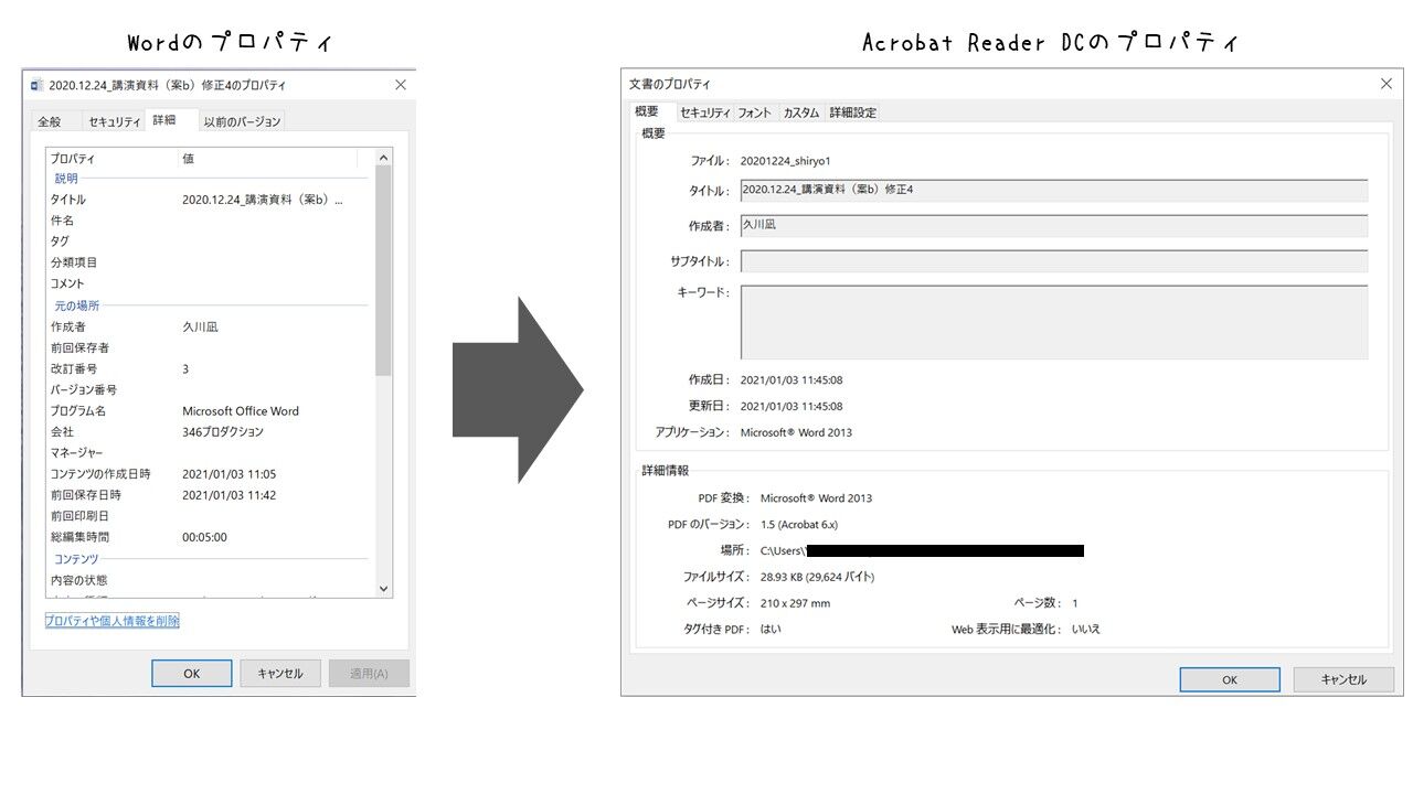 実例を見てみます。左が元データ(ワードファイル)のプロパティ、右がPDFのプロパティです。
