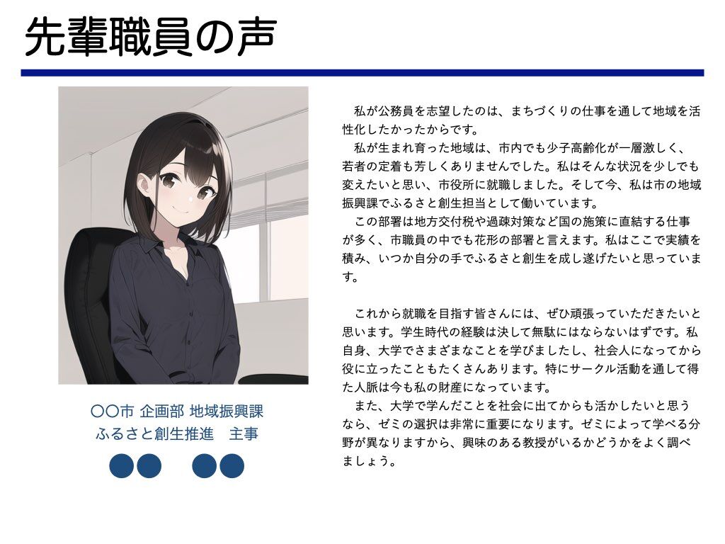役所がリリースする文章の中でも、ひときわ抽象的で主観的なのが採用パンフレット中の「職員の声」です。AIの傾向を見るに、「志望動機」「やりがい」みたいな主観的意見は十分対応できそうなので、試しに「AIのべりすと」に書いてもらいました。