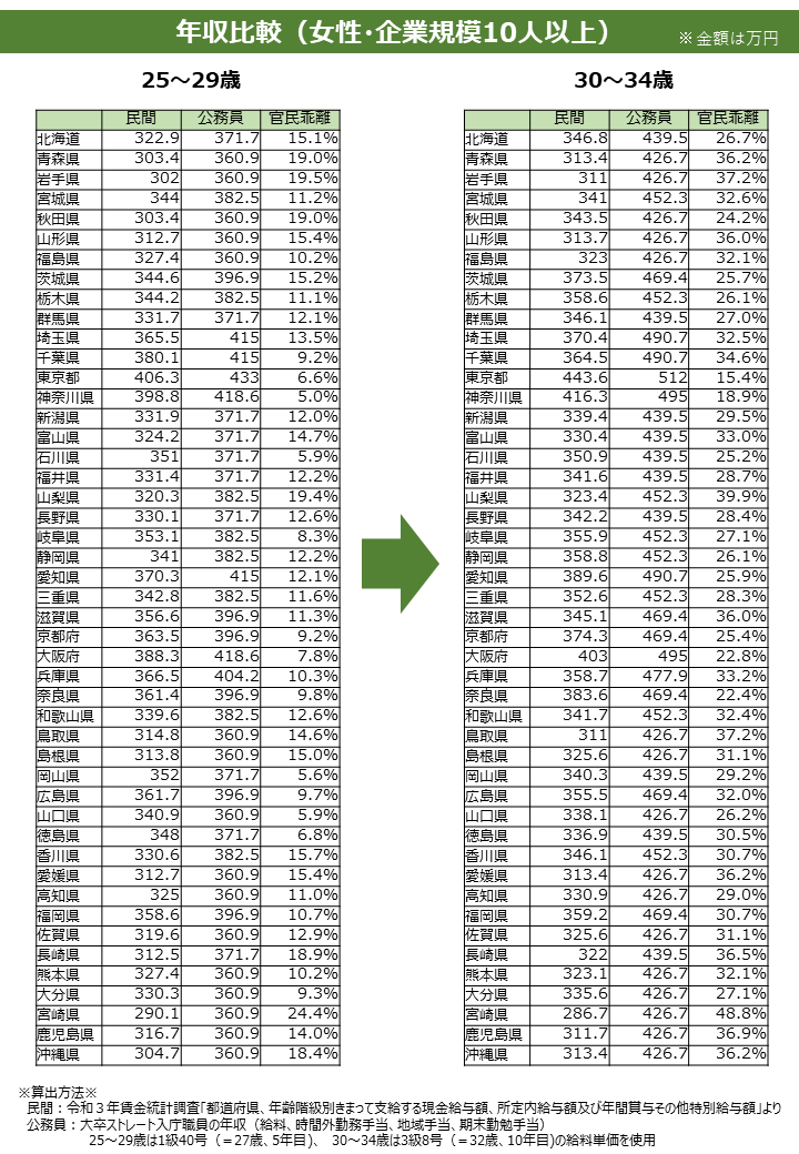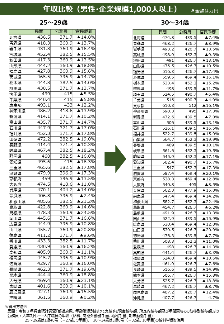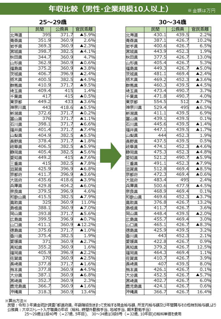 この統計調査から、都道府県別・年代別の民間企業従業員の平均年収を算出し、同年代の地方公務員年収と比較していきます。