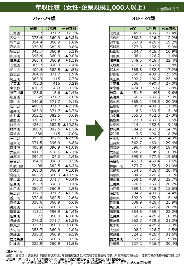 - 女性の場合、中小企業を含めると、地方公務員のほうが高水準。従業員1,000人以上規模の大企業に限って比較しても、半分以上の地域で地方公務員のほうが高水準。